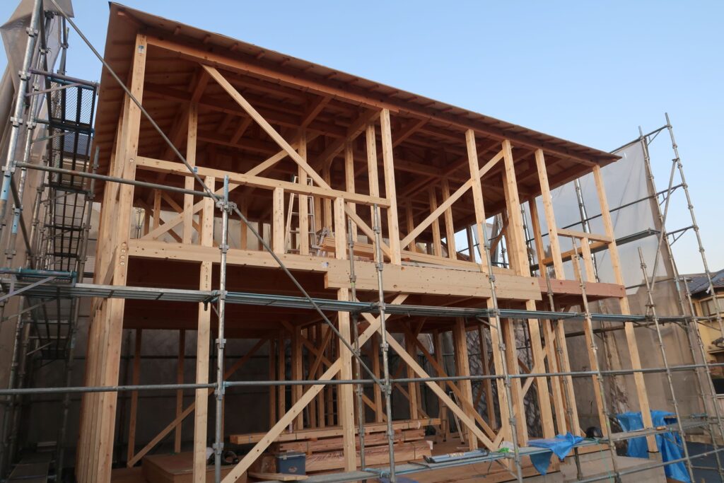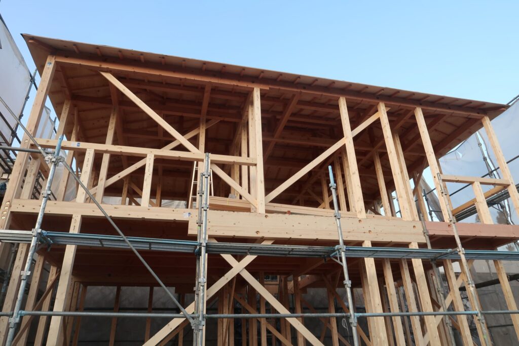夕方には構造材の他、外部合板の取り付けまで1日で完了しております