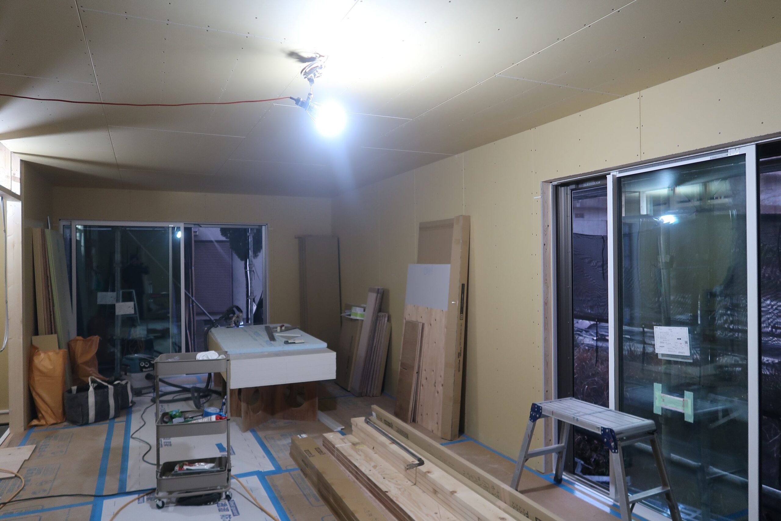 内部は石膏ボードの取り付けが進んで大工工事も大詰めです