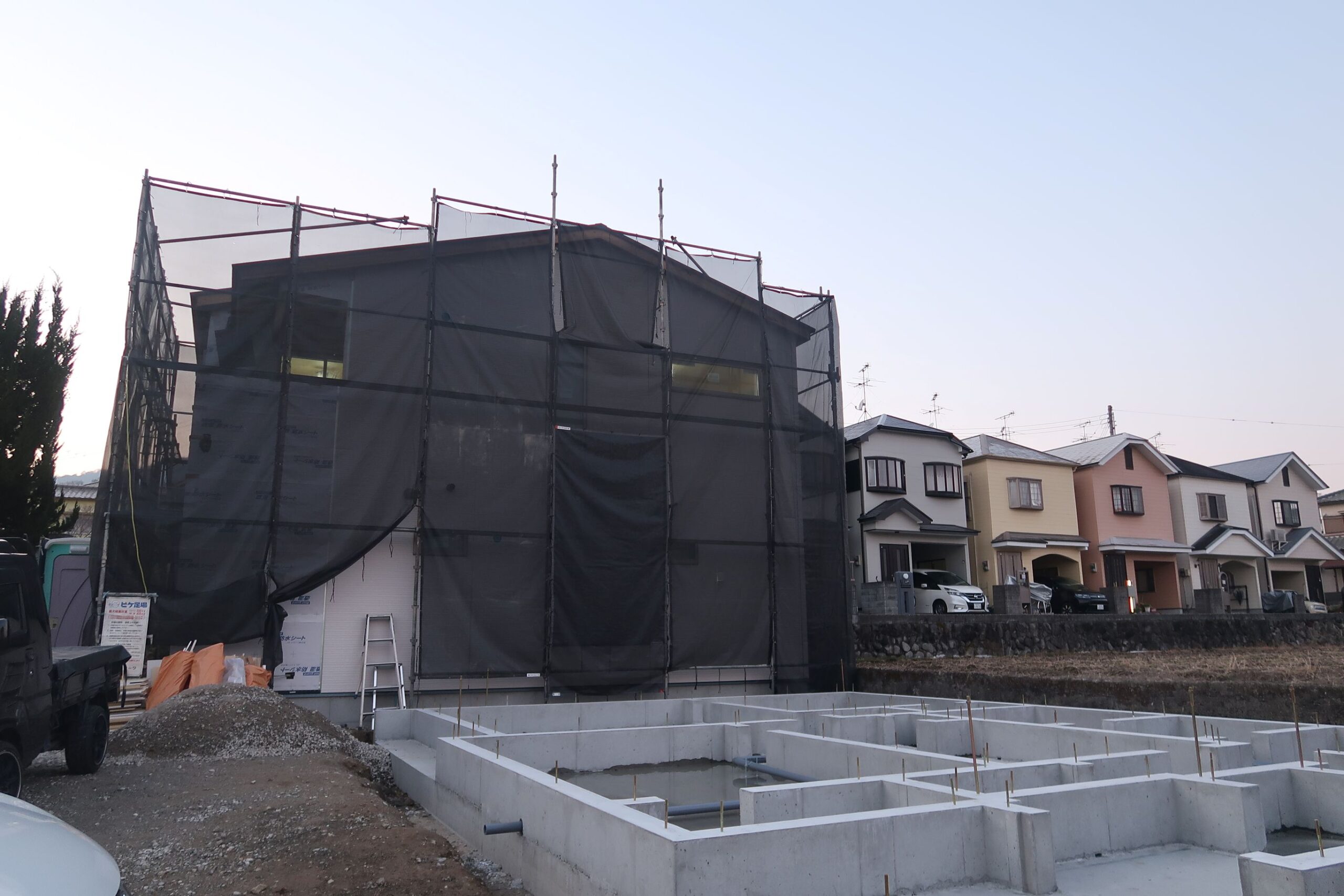 モデルハウスは外壁材の施工中 もう1区画は基礎が完成し来週の上棟を待ちます